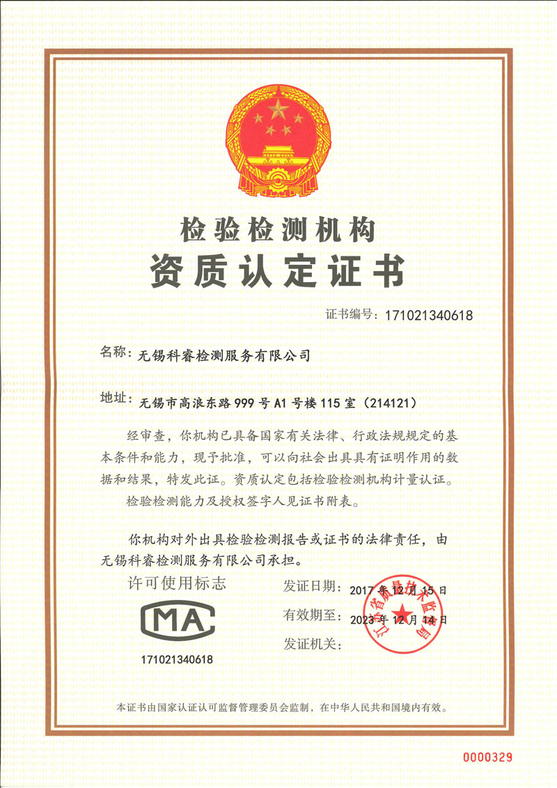 2010年取得CNAS證書,是無錫較早取得證書的民營第三方檢測公司,2014年獲得江蘇省民營科技企業(yè)的稱號,2017年獲得檢驗(yàn)檢測機(jī)構(gòu)資質(zhì)認(rèn)定證書(CMA)等多項(xiàng)榮譽(yù)資質(zhì)。 科睿檢測始終追求先進(jìn)科學(xué)的技術(shù),過硬質(zhì)量,貼心售后服務(wù)贏得了良好的市場口碑,客戶總數(shù)已達(dá)到1000 家以上,中國500強(qiáng)企業(yè)已超過100家。